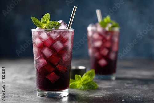 Refreshing iced blackberry mojito with mint and metal straw on dark background.