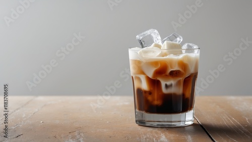 Refreshing Iced Coffee Drink with Milk and Ice Cubes on Wooden Table