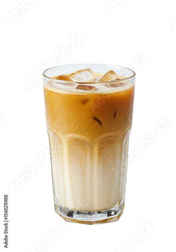 Refreshing iced coffee in a tall glass with ice cubes and creamy layers