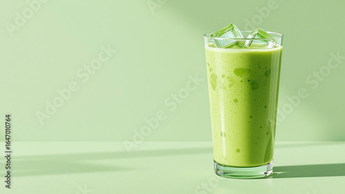 Refreshing Iced Matcha Latte in Minimal Glass with Condensation, Premium Photorealistic Beverage Photography.