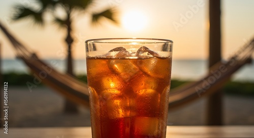 Refreshing Iced Tea at Sunset: Tropical Beach Relaxation with Hammock