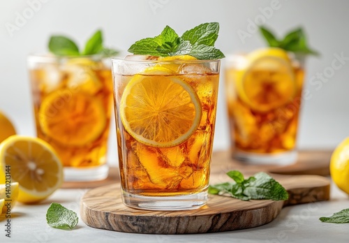 Refreshing iced tea beverage with lemon slices and fresh mint leaves on a wooden surface, perfect for summer gatherings and outdoor parties