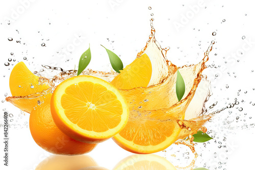 Refreshing image of water splashing around vibrant orange slices with green leaves, capturing the essence of freshness and vitality.