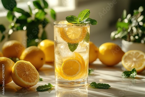 Refreshing lemon drink with mint and ice surrounded by fresh lemons in a sunlit setting Perfect for a hot day