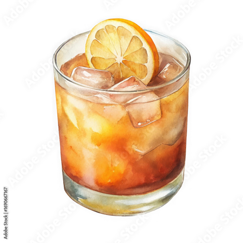 Refreshing orange cocktail with ice and a citrus slice in a clear glass on a dark backdrop .Watercolor illustration isolated on transparent background