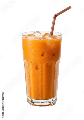 Refreshing orange drink with ice cubes in glass, accompanied by a straw, isolated