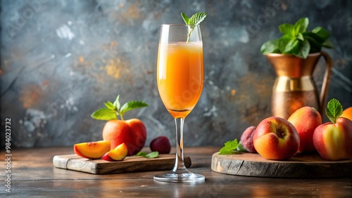 Refreshing Peach Cocktail with Mint Garnish on Rustic Background . peach bellini