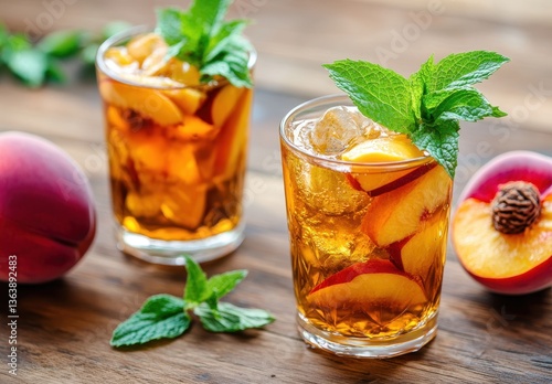 Refreshing Peach Iced Tea with Mint Leaves and Sliced Peaches in Glasses on Wooden Table with Fresh Peaches Beside It for Summer Enjoyment