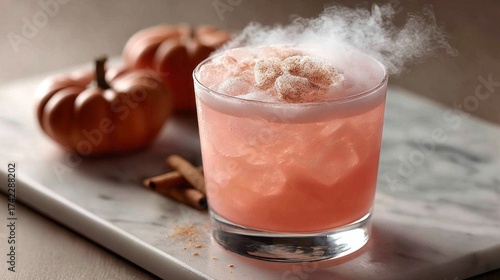 Refreshing pumpkin cocktail served over ice with a smoky effect and garnished with cinnamon