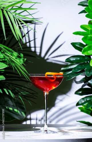 Refreshing red cocktail featuring gin, vermouth, and herbal liqueur served in a chic setting