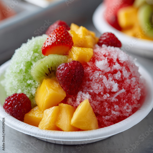 Refreshing shaved ice dessert with kiwi, mango, and berries.
