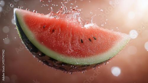 Refreshing slice of watermelon immersed in droplets of water against a misty background