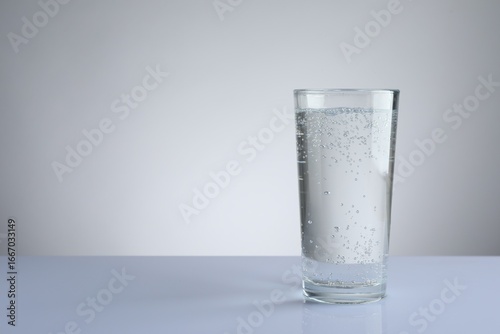 Refreshing soda water in glass on white table against light grey gradient background. Space for text