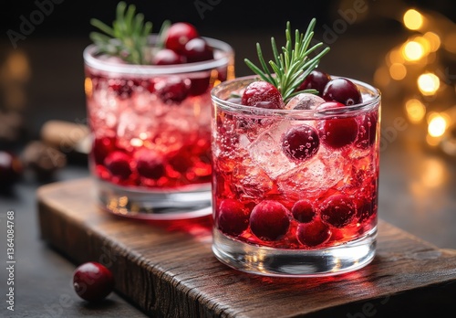 Refreshing Sparkling Berry Drink with Ice and Garnish on a Wooden Board with Festive Lights in the Background