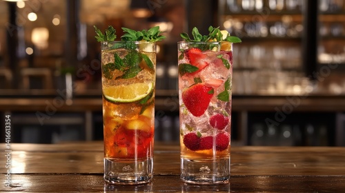 Refreshing summer beverages in tall glasses with fruit and herb toppings on a rustic wooden table