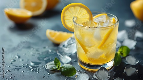 Refreshing summer lemonade drink with ice and lemon slices. Cold lemonade beverage with a garnish of fresh basil on a dark background. Closeup of citrus beverage.
