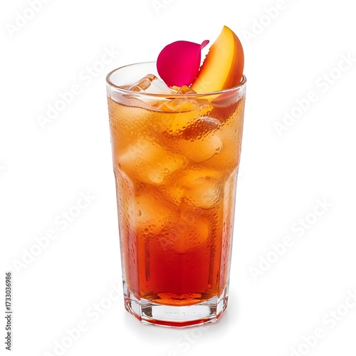Refreshing tall glass cocktail with ice fruit garnish and cherry topped drink