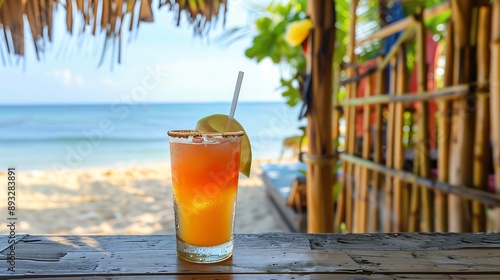 Refreshing tropical cocktail with lime wedge and straw on a beach bar counter.