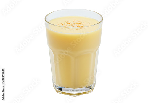 Refreshing turmeric latte in a sleek faceted glass topped with spice