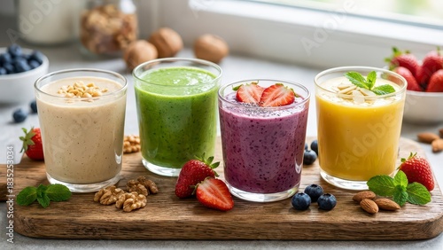 Refreshing Variety of Fruit and Vegetable Smoothies on a Wooden Board by a Bright Window