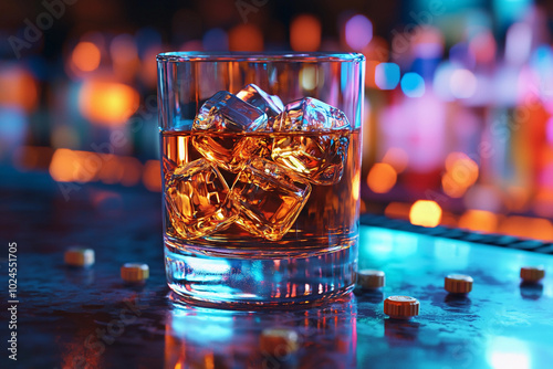 Refreshing whiskey cocktail with ice cubes on a vibrant bar counter