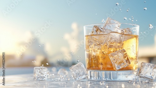 Refreshing Whiskey Glass with Ice Cubes and Splashes on Outdoor Table whiskey ice glass outdoor cold