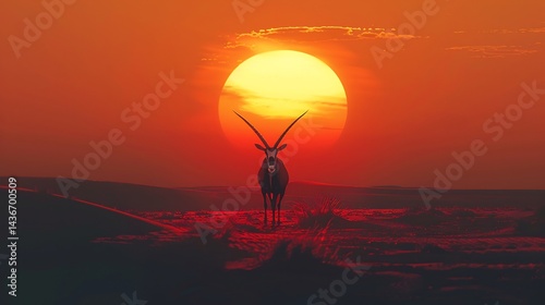 Regal Arabian oryx standing in the middle of a golden desert curved horns silhouetted against the setting sun cinematic wildlife portrait