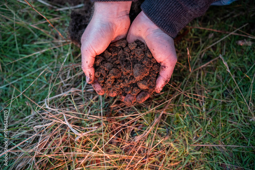 regenerative organic farmer, taking soil samples and looking at plant growth in a farm. practicing sustainable agriculture