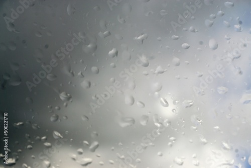 Regentropfen auf Glasschiebe vor grauer Himmellandschaft mit Sonne