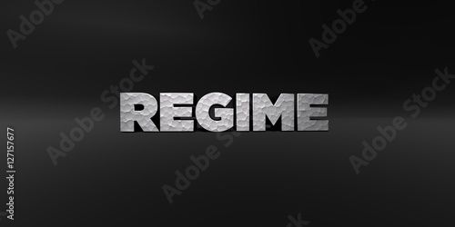 REGIME - hammered metal finish text on black studio - 3D rendered royalty free stock photo. This image can be used for an online website banner ad or a print postcard.