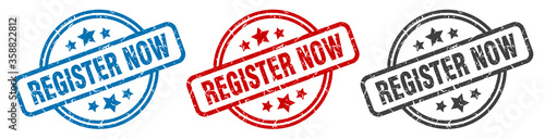 register now stamp. register now round isolated sign. register now label set