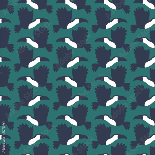 Regular seamless pattern with minimalist toucan birds vector. Blue and white birds on green background - animal surface design. Hand-drawn toucans silhouettes simple endless texture vector