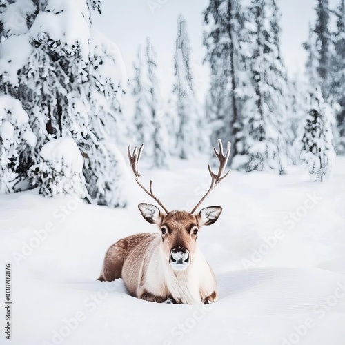 Reindeer resting under snow-laden pine trees, tranquil Lapland landscape