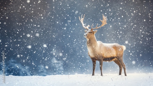 Reindeer standing in a snowy landscape under twinkling stars, with space on one side for a festive greeting. --ar 16:9 --v 6.1 Job ID: 13f2445f-5667-4464-aca1-2ad7b0e67a14