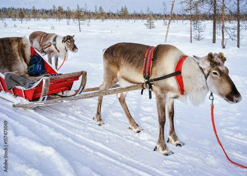 Reindeer without horns in sledge at winter Finnish Lapland