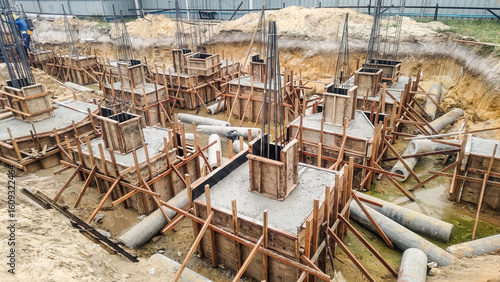 Reinforced Concrete Foundation Work – Construction Site with Column Starter Bars and Formwork