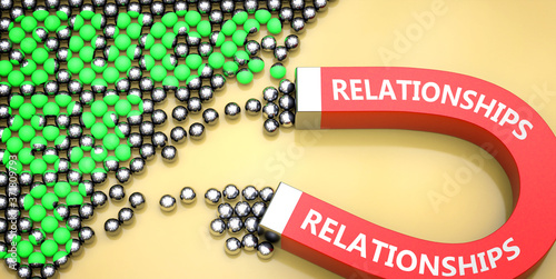 Relationships attracts success - pictured as word Relationships on a magnet to symbolize that Relationships can cause or contribute to achieving success in work and life, 3d illustration