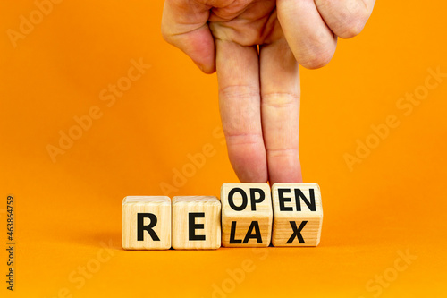 Relax and reopen symbol. Businessman turns cubes and changes the word 'relax' to 'reopen'. Beautiful orange table, orange background. Business, relax and reopen concept. Copy space.