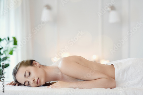 Relaxed beautiful young woman lying on the couch after massage in the spa
