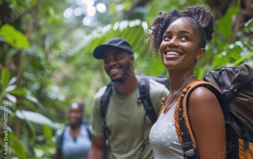 Relaxed black friends hiking together among tropical plants, copy space. Blurred background, defocused jungle. Bucket list lifestyle. Experiences, epic dreams, thrill seeking, ultimate goal concept