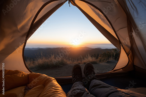 Relaxed Camper’s Sunrise View from Tent Overlooking Mountain Ridge