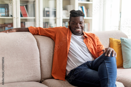 Relaxed cheerful black guy chilling on couch at home