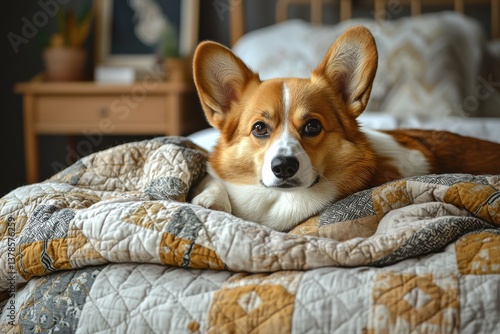 Relaxed corgi dog lying comfortably on a cozy bed in a modern bedroom