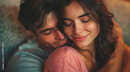 Relaxed couple cuddling smiling with eyes closed closeup image. Gentle embrace boyfriend girlfriend caucasian close up photography. Peaceful moment of affection concept photo realistic