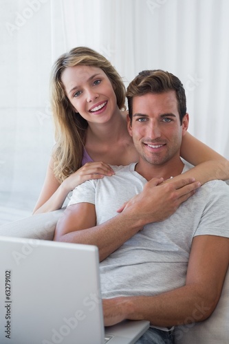 Relaxed couple using laptop on couch