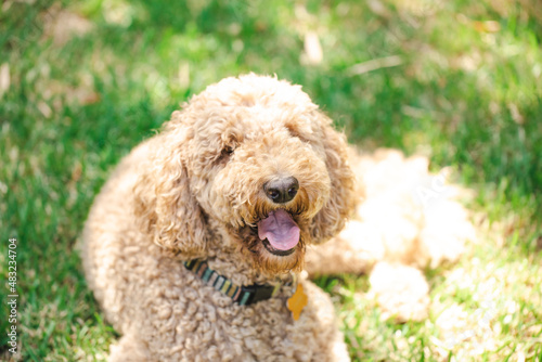 Relaxed Groodle mixed-breed dog, also known as Golden Doodle (Poodle Golden Retriever Cross) in garden setting
