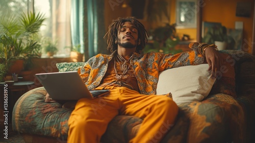 Relaxed Individual in Vibrant Outfit Sitting on a Couch with Laptop Surrounded by Plants and W