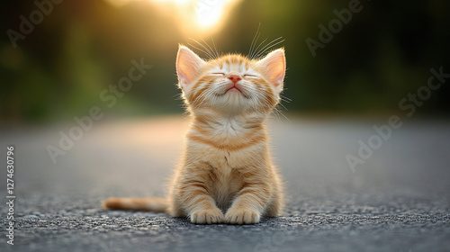 Relaxed orange tabby kitten with closed eyes enjoying peaceful moment outdoors on rustic pavement, capturing warmth and serenity.