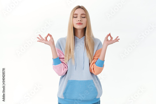 Relaxed, peaceful blonde girl in hoodie, keep calm and patient, close eyes and breathing during meditation, reach zen or nirvana, hold hands sideways, standing in lotus pose white background
