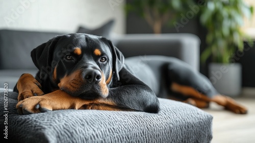 Relaxed Rottweiler Resting Comfortably on a Gray Sofa in Modern Living Room